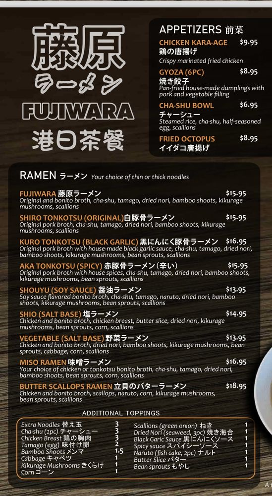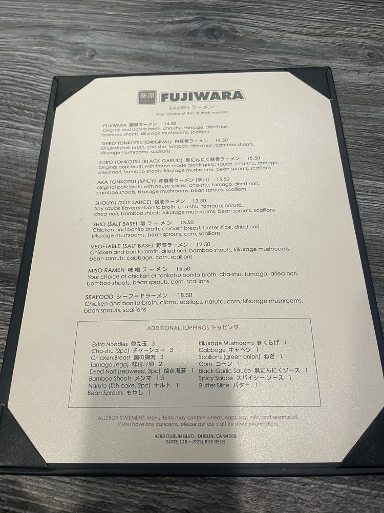 Welcome to Fujiwara, a hidden gem in Dublin, CA, renowned for its authentic Japanese ramen and vibrant atmosphere. This casual yet trendy eatery offers a delightful menu, featuring savory options like the Kuro Tonkotsu, infused with rich black garlic in a delectable pork broth, and the classic Shouyu ramen, crafted with bonito dashi and fresh ingredients. The cozy space welcomes groups, making it ideal for family dinners or casual outings, especially on bustling weekends.