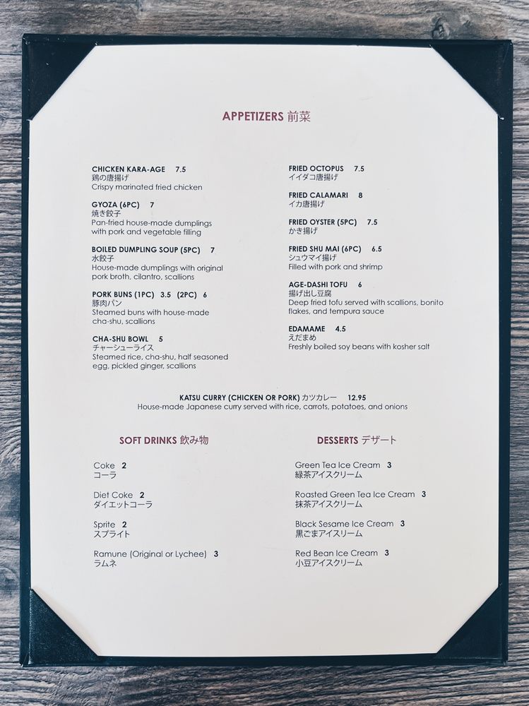 Original pork broth with bonito dashi, cha-shu, bamboo shoots, dried nori, Tamago, kikurage mushrooms, scallions.